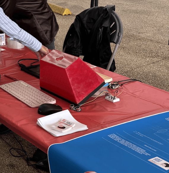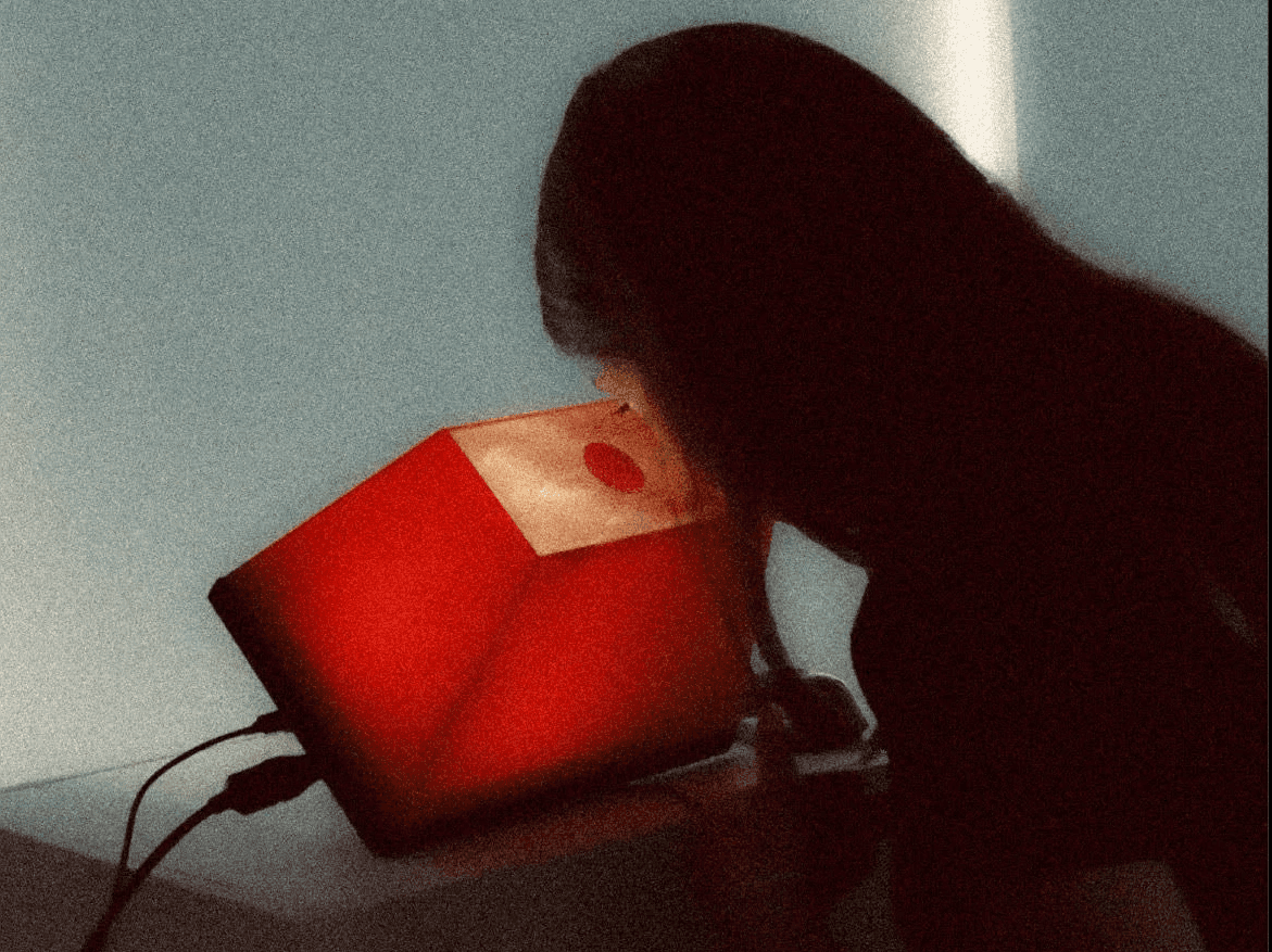 The visitors explored the installation by looking into the lens hole and got demonstrations from the maker about the prototype